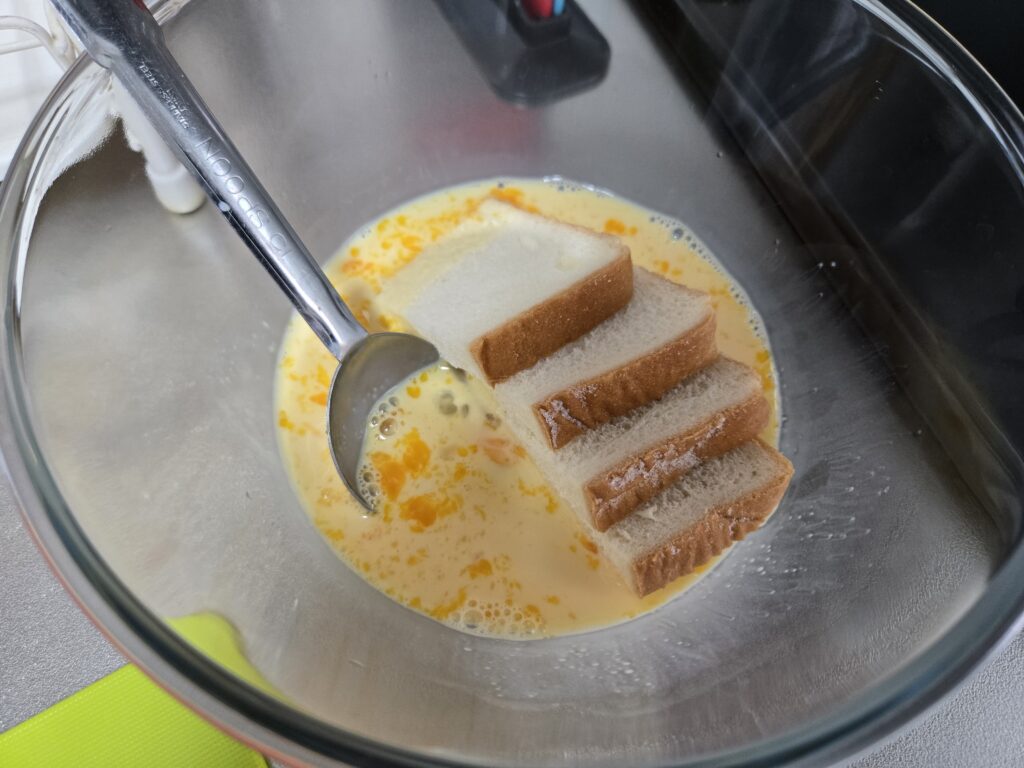 続いて、ボウルに各種調味料を入れてかき混ぜ、パンを浸します。