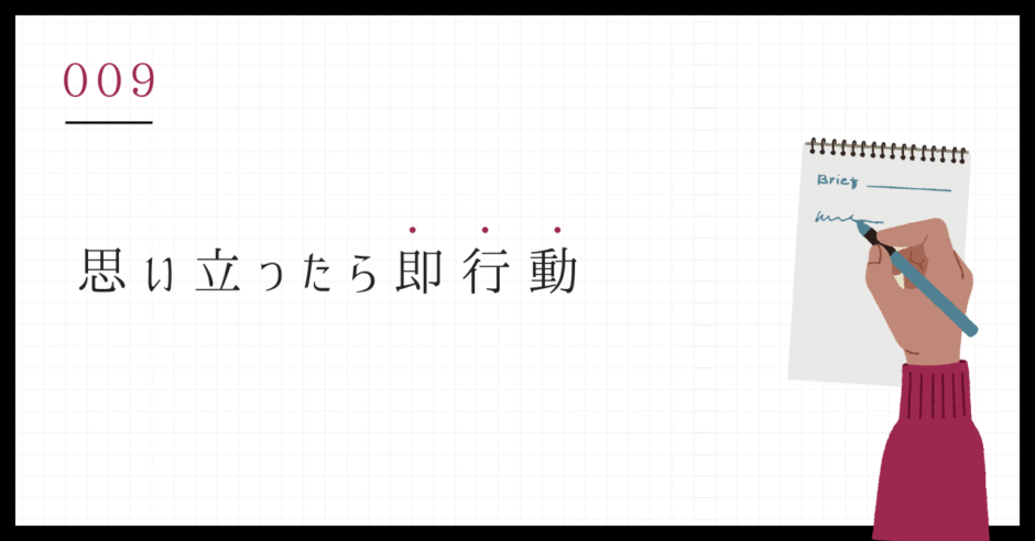 だからこそ「即行動」が重要なのです。「思い立ったが吉日」ということわざの通り、余計なことを考え出す前に動いてしまうことが、人生を変える最良の契機となります。